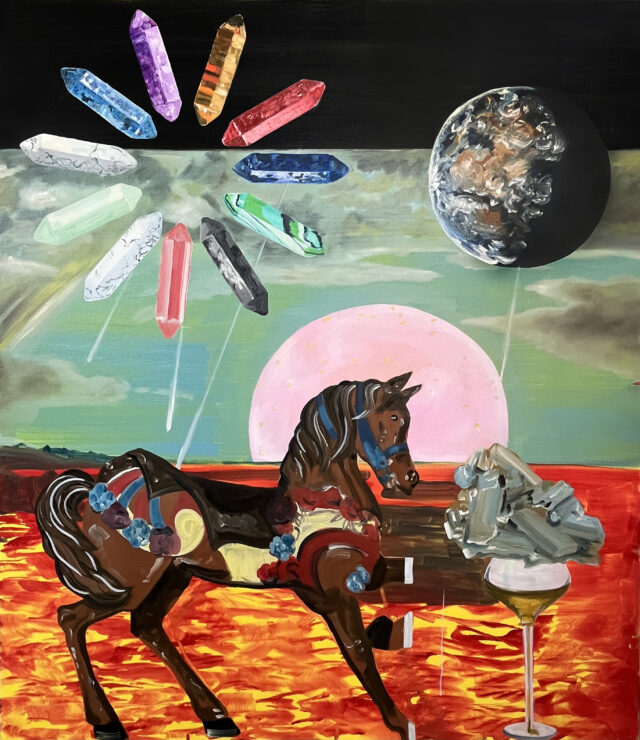 Geisberg Gallery is pleased to present “Sorry for the Damage” by Marjolijn de Wit, an exhibition of oil paintings by the Netherlands-based artist. Exuberant and lush, the paintings are in a relatively small scale for the artist, whose oeuvre includes larger canvases and floor installations, as well as collage based works that are inspired by or incorporate ceramic pieces. In her third solo exhibition, De Wit hones in on the startling disconnect between the advertising and the editorial content of National Geographic magazines from the 1970’s and 80’s. Seen from the vantage point of our time, the articles and imagery that promote the wonders and diversity of the earth are negated by a lifestyle bent on our planet’s ruination. Extraction of gems, minerals, or fossil fuels, luxury underpinned by unseen carbon footprints; food delivered from every corner in every season at an environmental cost; these issues have grown more prominent today. Nonetheless, her paintings are not meant to hector. De Wit throws together isolated symbols seamlessly as she adamantly luxuriates in her medium. Her jewel-like paintings flutter their painterly eyelashes at us, coyly cooing into our psyches. Schematic compositions resist clear readings, as each opaque yet aesthetically jarring composition provokes the viewer to parse De Wit’s connections.